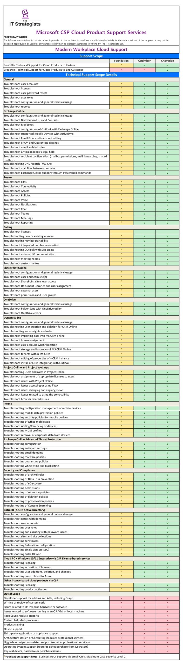 - Microsoft escalation support includes up to a maximum Critical business impact (Severity A – Critical): <1 hour, with resolution tracking.